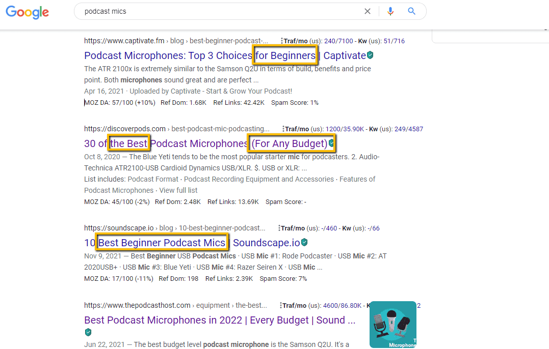 Aqui estão os principais resultados para “microfones de podcast”. Observe como cada um dos posts destacados no ranking tem um ângulo diferente.