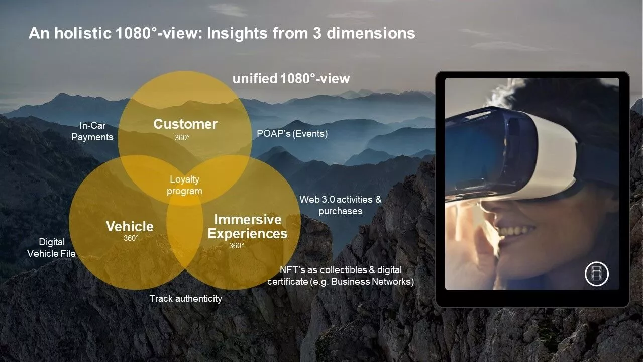 Mas com novas tecnologias e capacidades, há ainda outra dimensão. A combinação da visão de 360 graus do cliente com o veículo forma uma visão mais ampla de 720 graus. Adicionar a nova dimensão de experiências imersivas com NFTs, POAPs e o metaverso forma uma visão exclusiva de 1080 graus do cliente.