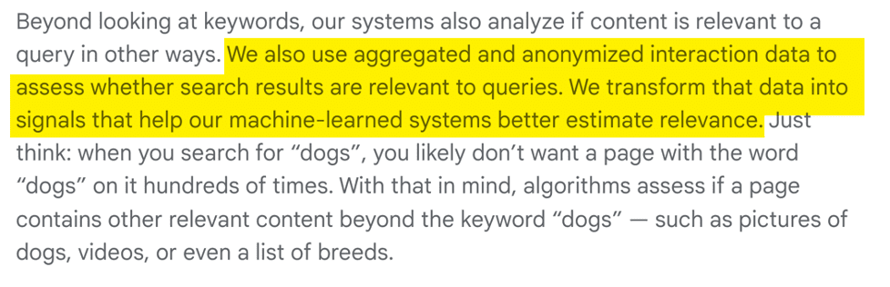 Em alguns casos, os algoritmos do Google podem determinar que a intenção do usuário mudou, de modo que o conteúdo conciso é preferível ao conteúdo de formato longo. O que nós, como SEOs, sentimos como “bom conteúdo” pode nem sempre ser o melhor para atender às necessidades do pesquisador. Você pode achar interessante este artigo de Cyrus Shepard no blog da Moz, pois discute as patentes do Google que analisam o uso de sinais de engajamento do usuário para treinar modelos de aprendizado de máquina .