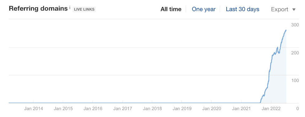 Aqui está um exemplo. Ahrefs mostra que este site criado para vendas de afiliados teve um grande aumento em domínios de referência desde o lançamento recentemente. Este site estava construindo seus próprios links para fins de SEO.