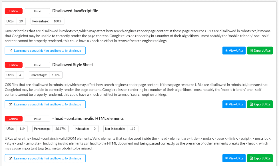 Em última análise, usar uma ferramenta como o Screaming Frog para rastrear completamente um site pode fornecer mais informações, mas você precisa ter experiência para saber o que fazer com essas informações! Novamente, você está procurando problemas que impeçam o Google de rastrear, renderizar ou entender seu conteúdo. Uma alternativa é o Sitebulb , que lhe dará pistas sobre quais problemas técnicos estão presentes e como ou mesmo se eles devem ser corrigidos.