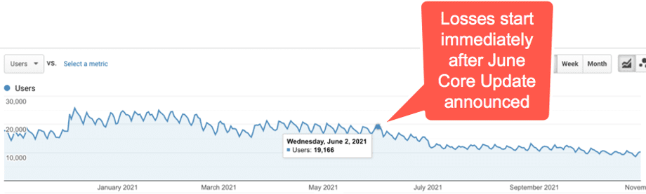 Vale a pena notar que vimos vários casos em que os sites viram quedas no tráfego coincidentes com atualizações do Google onde havia outra causa. Se você fez alterações recentemente em seu site, como uma migração ou alteração significativa de design, você deve olhar para elas primeiro como um possível motivo para sua perda de tráfego orgânico. Também vale a pena ler todo este artigo para ver se alguma das outras causas possíveis para as perdas de tráfego podem estar afetando você.