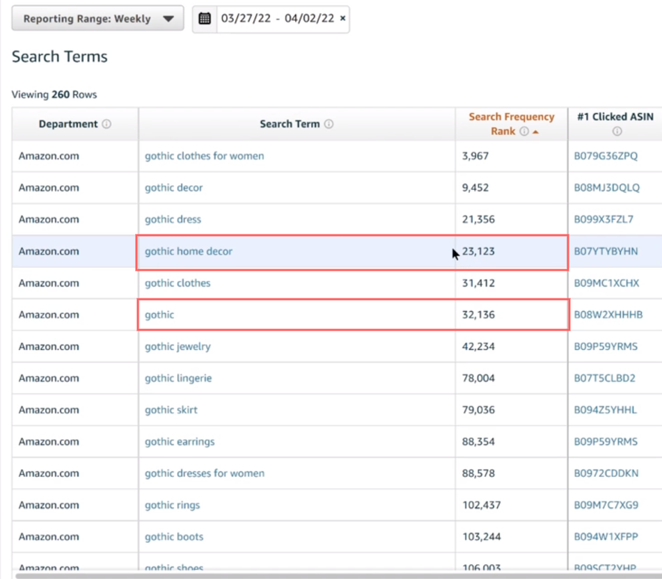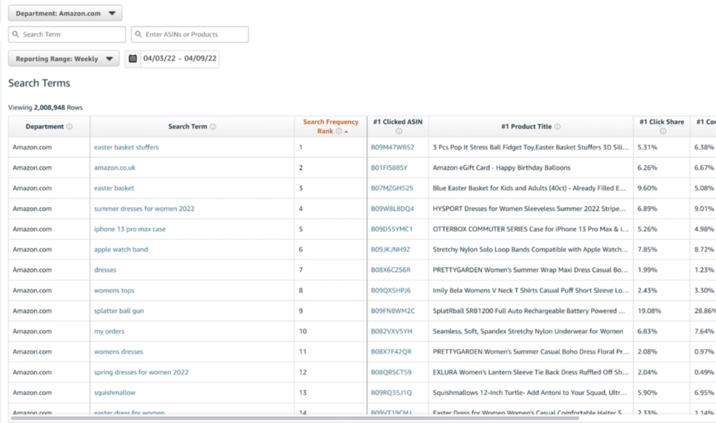 Há alguns anos, a Amazon lançou algo chamado Brand Analytics . Isso forneceu aos vendedores uma maneira de ver os 1 ou 2 milhões de termos mais pesquisados na semana, dia, mês ou mesmo trimestre anterior.