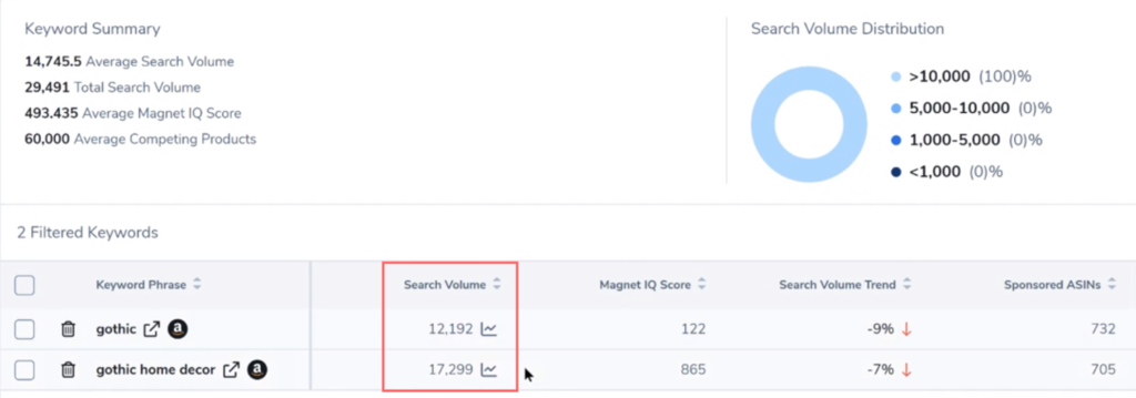 Lembre-se de que, se você comparar o volume de pesquisa semana a semana no Helium 10, ele não estará 100% alinhado com os números do Brand Analytics da Amazon. No entanto, nossas estimativas de volume de pesquisa se alinham o mais próximo possível sem realmente ter acesso aos dados brutos “sob o capô” da Amazon.
