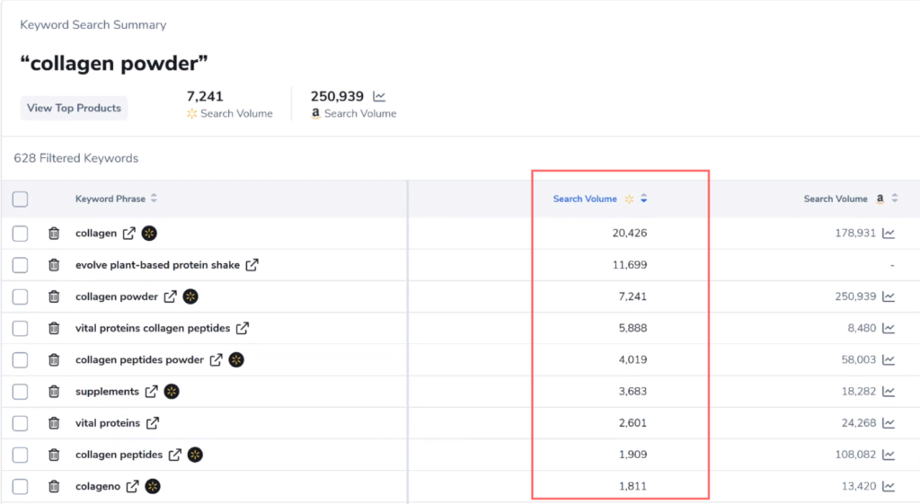 Por exemplo, a palavra-chave “colágeno” tem 20.000 pesquisas no Walmart. Na Amazon, vemos um volume estimado de 180.000.