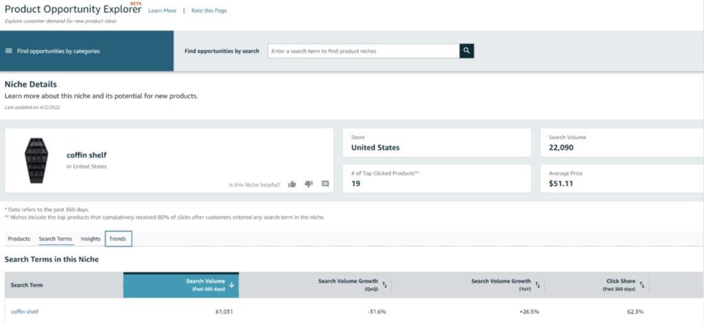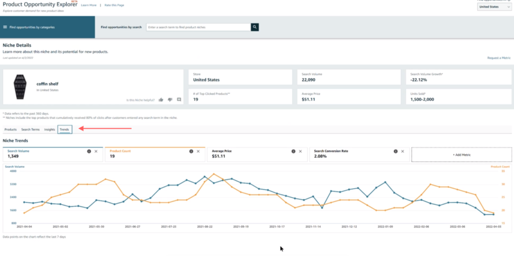 Um dos recursos mais recentes do Product Opportunity Explorer está localizado na guia "Tendências".