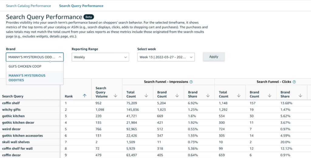 Vamos falar sobre o novo garoto no bloco. É o desempenho da consulta de pesquisa . Isso é encontrado no Brand Analytics e fornece uma forma de visibilidade do desempenho do seu termo de pesquisa com base no comportamento de pesquisa do comprador em um período de tempo selecionado. Ele mostra as métricas dos principais termos do seu catálogo, como exibições de pesquisa, cliques, adições ao carrinho de compras, compras e muito mais. Lembre-se de que isso é apenas para vendedores registrados de marca.