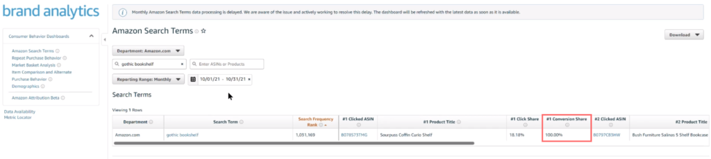 Decidi revisitar o Brand Analytics em outubro do ano passado. Lembro-me que foi quando havia alguns produtos que vendiam para esta palavra-chave. Com certeza, encontrei o termo de pesquisa “estante gótica” e vi que o produto aqui tem 100% das conversões.