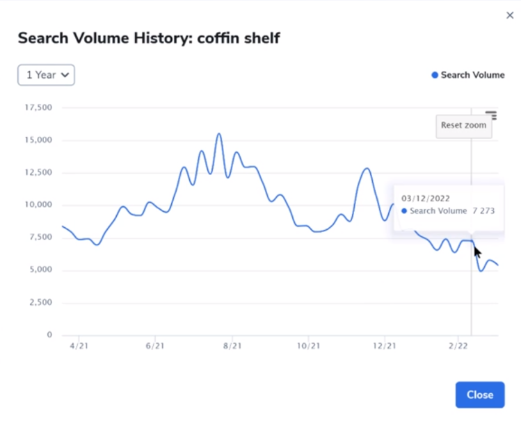 A palavra-chave “prateleira de caixão” exibe o volume de pesquisa nos últimos 360 dias , cerca de 61.000 pesquisas.