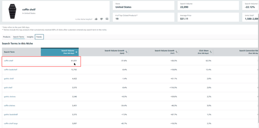 Está me mostrando que isso tem um volume de pesquisa de 22.090. Agora, isso pode ser confuso. Isso não significa que a frase “prateleira de caixão” tenha um volume total de pesquisa de 22.090. Isso representa um volume de pesquisa de 22.090, o volume de pesquisa nos últimos 90 dias de todas as palavras-chave que a Amazon diz fazer parte desse nicho . Tenha isso em mente.