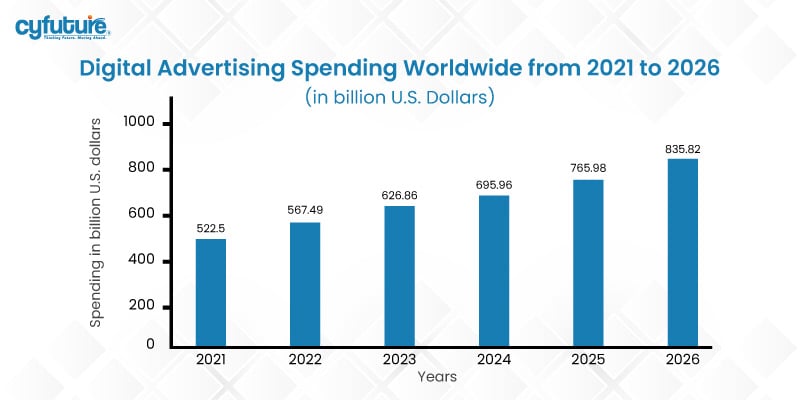 Estima-se que os gastos com publicidade no mercado de publicidade digital ultrapassem US$ 695 bilhões até 2024 e US$ 835 bilhões até 2026.