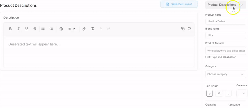 A geração da descrição do produto com TextCortex requer nome do produto, nome da marca , características do produto , categoria , tamanho do texto e nível de criatividade .