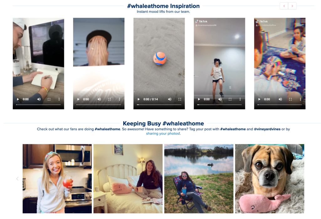A empresa de roupas Vineyard Vines convida os usuários a compartilhar como estão ocupados – e seguros – em casa com sua hashtag #WhaleAtHome. O Vineyard Vines aproveita ao máximo o UGC compartilhando esses envios no Instagram e nas galerias do site.