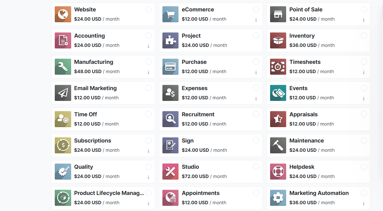 Preços: você pode escolher usuários por US$ 24/mês ou escolher os recursos individuais que deseja em uma lista de aplicativos por preços que variam de US$ 12 a US$ 72/mês. Por exemplo, você pode obter Ponto de Venda por US$ 24/mês e CRM por US$ 24/mês. As integrações extras funcionam de maneira semelhante.