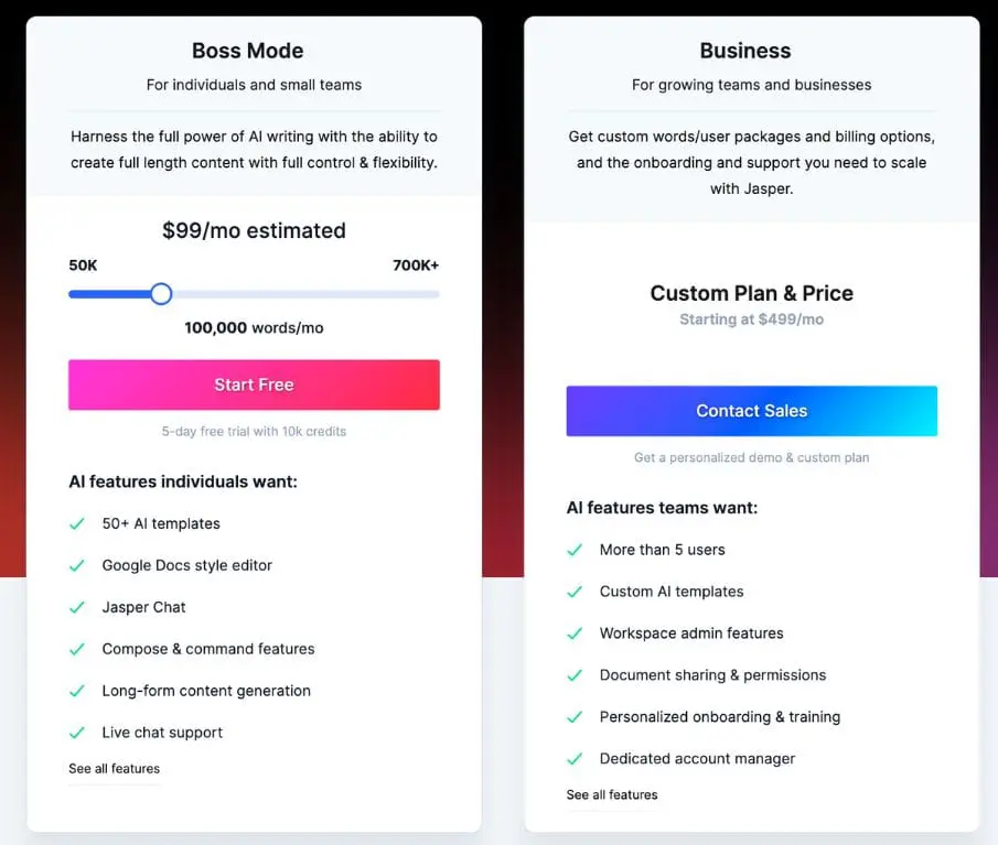 Jasper AI compreende 2 planos de preços que incluem: