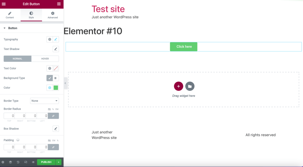 Neste exemplo, selecionamos um widget de botão . Na guia Conteúdo , você pode editar o texto no botão, adicionar links e ajustar o tamanho. Você pode alterar as cores, o plano de fundo e a fonte na guia Estilo :