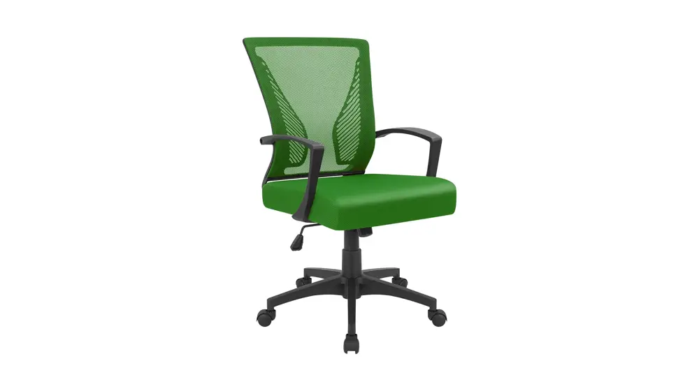A Hbada Home Office Desk Chair é uma cadeira moderna que economiza espaço com apoios de braços retráteis para que você possa deslizar facilmente a cadeira sob a mesa quando não estiver em uso. A cadeira apresenta almofadas macias e resistentes ao desgaste feitas de camadas espessas de esponja natural e tecido de malha respirável nas costas, evitando suor e desconforto durante longas horas sentado.