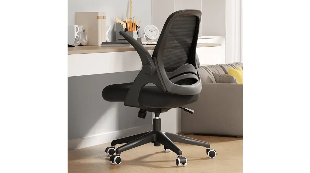 A cadeira Hbada Home Office Desk com Flip Up Arm também oferece movimento silencioso e flexível com seu ajuste de ângulo de inclinação oscilante e rodízios de rolamento suave.
