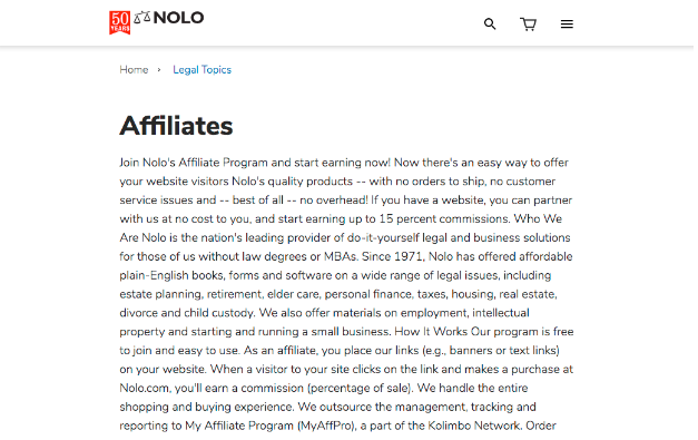 Nolo é um ótimo programa de afiliados porque é um serviço relevante para muitos consumidores, vendedores de encerramento e vendas a descoberto em particular. Você também pode esperar altas taxas de conversão, pois a Nolo é uma empresa de consultoria jurídica reconhecida e respeitada.
