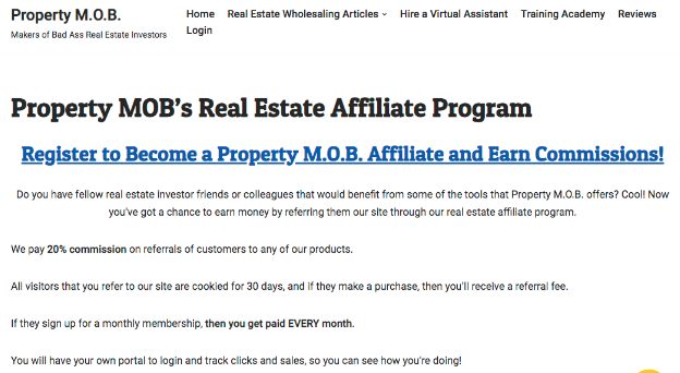 Com o programa de afiliados Property MOB , você pode ganhar até 50% de comissão por indicações bem-sucedidas de cursos de venda por atacado de imóveis.