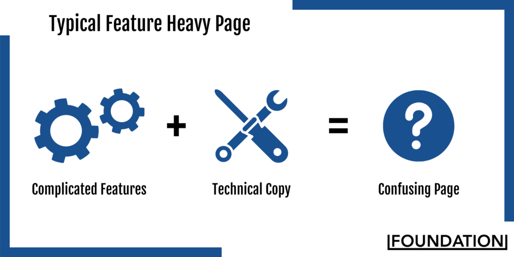Em setores técnicos, como transporte e logística, a maioria dos sites das empresas é pesada em termos técnicos do setor e se concentra em recursos do produto que podem sobrecarregar facilmente o usuário. Uma página típica com muitos recursos se parece muito com esta fórmula: