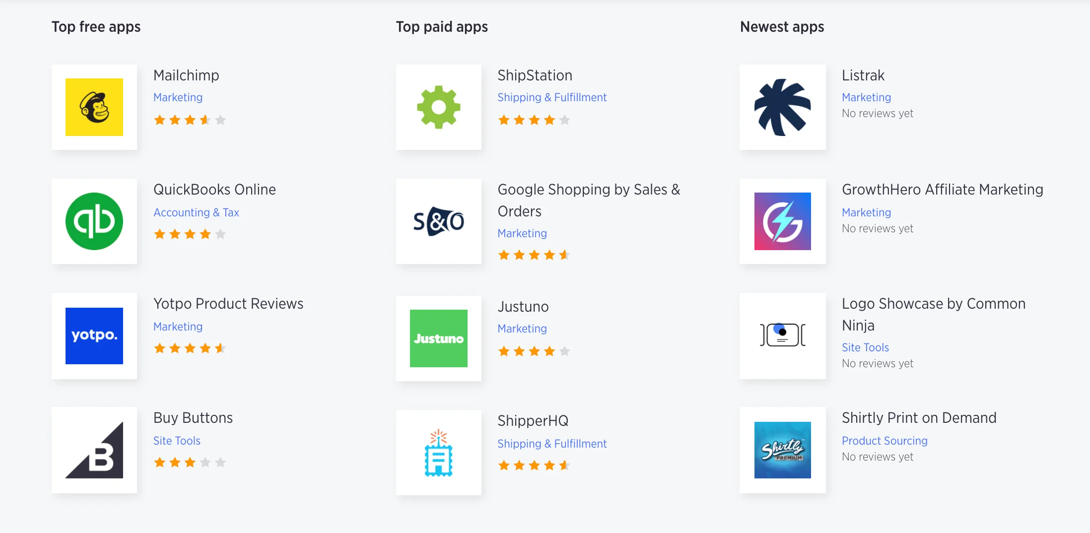 - Disponibilidade limitada de complementos : o mercado de aplicativos BigCommerce é pequeno e não possui a profundidade ou amplitude de outras configurações quando se trata de soluções muito personalizadas. Especialmente quando você compara com Shopify Plus – a plataforma com um enorme ecossistema de aplicativos e agências, o BigCommerce Enterprise definitivamente tem a desvantagem nessa área.
