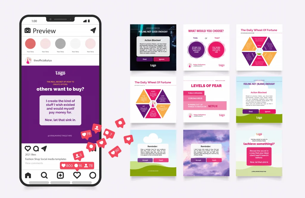 Esses modelos são ótimos para economizar tempo, reduzir o estresse e aumentar o envolvimento nas redes sociais! Como posso saber disso? Bem, porque eu os criei.