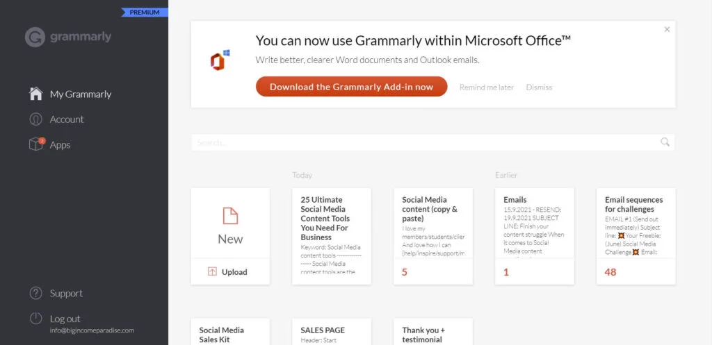 - Pro (US$ 49/mês ou US$ 432/ano, palavras ilimitadas, projetos ilimitados, 5 licenças de usuário, mais de 90 ferramentas de redação, 500 créditos de fluxo de trabalho por mês, acesso aos recursos mais recentes, suporte prioritário por e-mail)