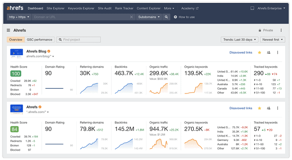 Ahrefs é uma ferramenta de SEO popular e uma das nossas favoritas no Accelerate. Gostamos do prático painel central, onde você pode ver todos os seus projetos rapidamente, as ferramentas avançadas de filtragem e a riqueza de insights de 295 bilhões de páginas indexadas.