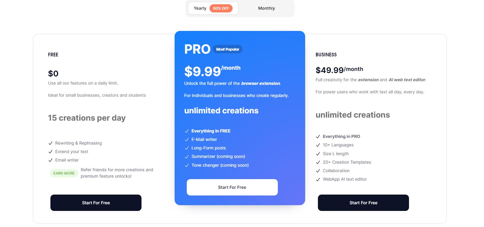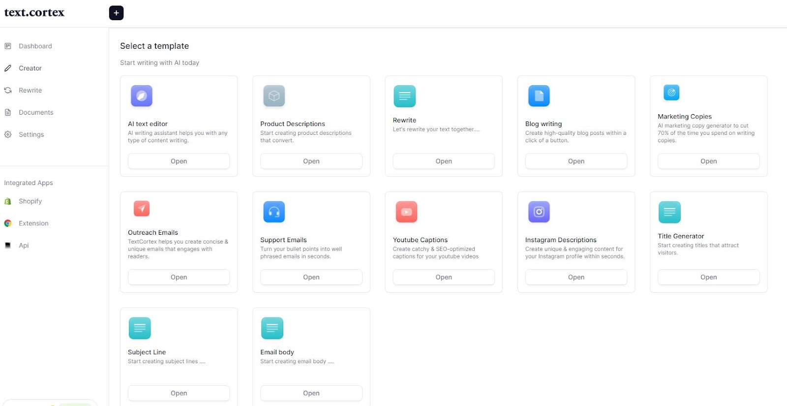 Por exemplo, TextCortex permite gerar 15 criações gratuitas diariamente para qualquer conteúdo, e você sempre pode receber mais criações gratuitas recomendando o software.