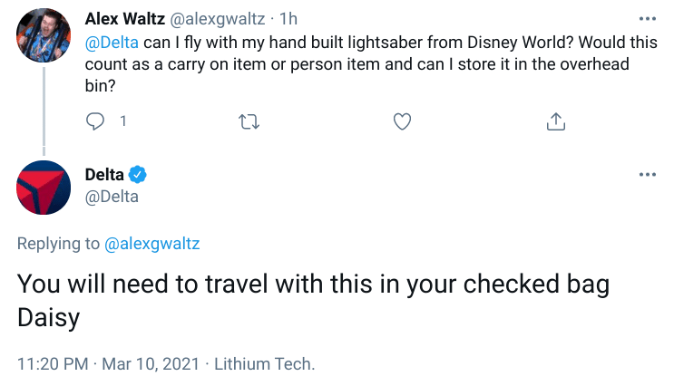 Dê uma olhada neste exemplo da conta do Twitter da Delta Air Line. Eles foram capazes de responder a uma pergunta rapidamente e garantir que alguém tivesse uma ótima experiência com o atendimento ao cliente. (E agora todos sabemos que os sabres de luz precisam ir na sua bagagem despachada).