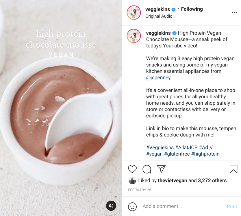 Este post é um anúncio da JCPenney sobre seus utensílios de cozinha. Como o Veggiekins é um blog popular de comida vegana, não é surpresa que a JCPenney tenha colaborado em utensílios de cozinha. Uma recomendação de um blogueiro de comida favorito ajuda a estabelecer autoridade sobre a qualidade de seus produtos.