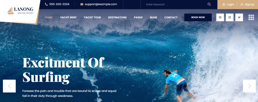 Vamos começar com o Lanong Yacht Rental Theme para WordPress. Este é um tema de ótima aparência para qualquer site que lide com aluguel de um iate ou prestação de serviços relacionados a esportes aquáticos. Este tema é baseado no Elementor. Devido a isso, é muito fácil para qualquer usuário do WordPress construir um site.