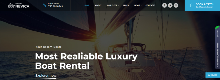 Para fornecer aos seus clientes uma experiência de qualidade, você pode usar o Nevica Boat Rental Theme. É um ótimo tema para fazer um belo site que gira em torno de aluguel de iates e barcos. Claro, você pode personalizá-lo para atender às suas necessidades de negócios.