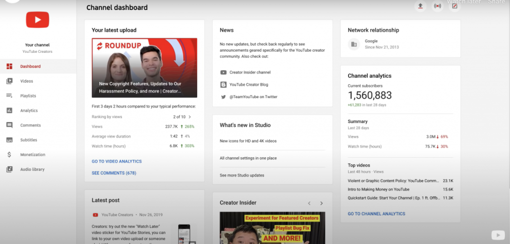 Uma das melhores maneiras de acompanhar o sucesso de SEO do seu canal e vídeo é usar o painel analítico do YouTube.