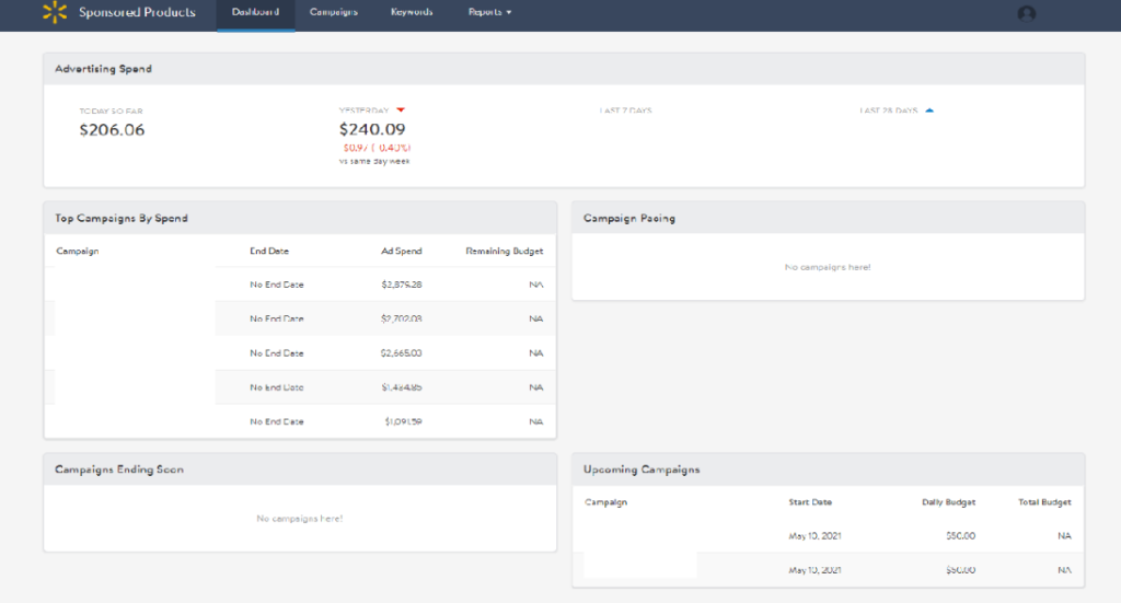 Centrul de anunțuri Walmart este locul unde se întâmplă magia (gândiți-vă la Managerul de campanii Amazon.) Din acest tablou de bord, vă puteți controla anunțurile și puteți vedea performanța campaniilor actuale și anterioare. Deși Centrul de anunțuri nu este la fel de robust ca Campaign Manager (mai ales când vine vorba de amploarea raportării), este ușor de navigat și simplu.