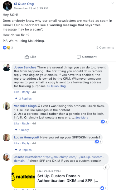 Avantajul de a fi într-un grup Facebook plin de publicul țintă este că comentariile tale sunt văzute nu numai de persoanele cărora le răspunzi în mod specific, ci și de mulți alții din grup.