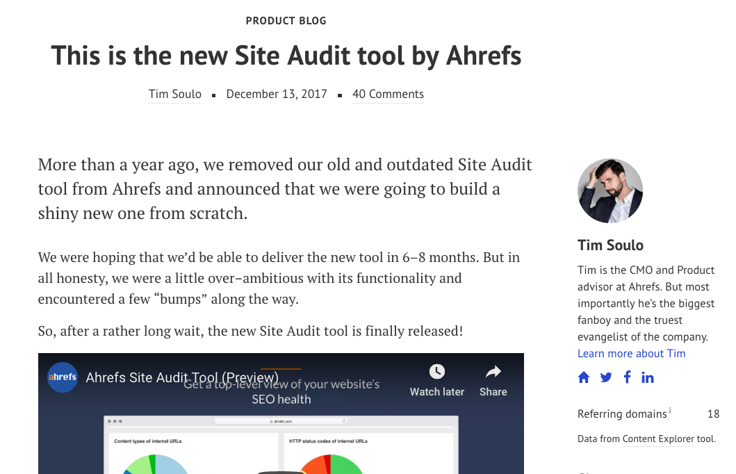 În loc să trimită doar noua și îmbunătățită funcție de auditare a site-ului și să o numească o zi, Ahrefs CMO Tim Soulo a publicat un ghid complet despre cum să utilizați noul instrument.