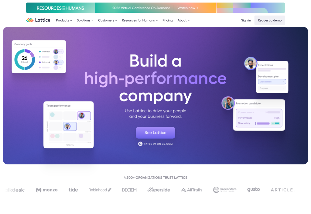 Lattice facilitează, de asemenea, analize individuale de performanță și feedback de la angajați către manageri. Managerii pot urmări angajații prin sondaje și pot măsura scorurile nete ale angajaților în cadrul departamentelor lor.
