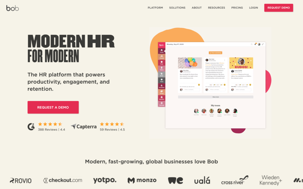 HiBob este o platformă de gestionare a persoanelor care combină funcțiile de bază de HR cu instrumente de urmărire a timpului și a prezenței. Software-ul poate stoca documentele angajaților și oferă instrumente pentru integrarea noilor angajați. Include, de asemenea, instrumente de urmărire a timpului. Cu toate acestea, acestea sunt destul de simple și nu acceptă mementouri bazate pe locație sau restricții de intrare.