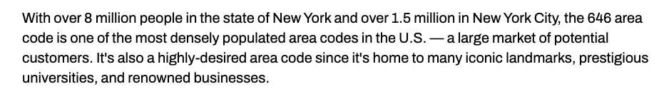 Personalizare pentru ținte de mare valoare: pentru codurile de zonă cu atractivitate comercială semnificativă, cum ar fi 646 din Manhattan, Dialpad oferă conținut personalizat care subliniază beneficiile unice ale securizării unui număr în astfel de zone.