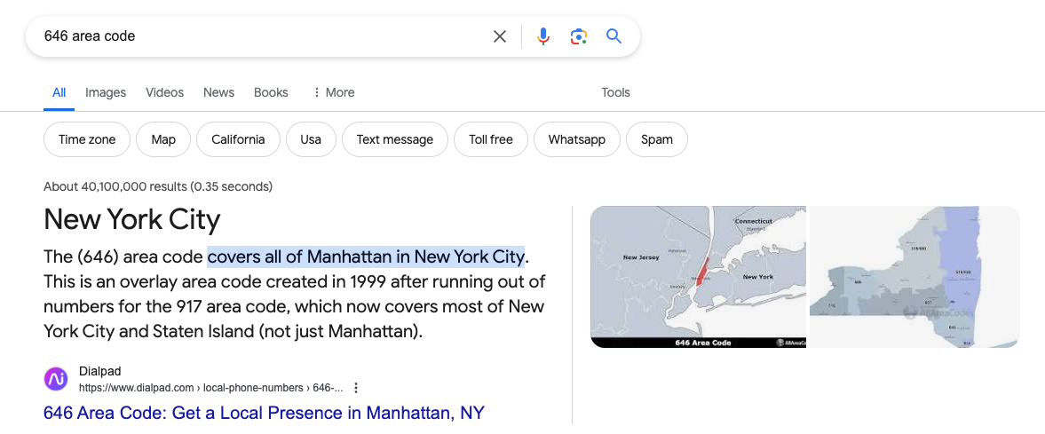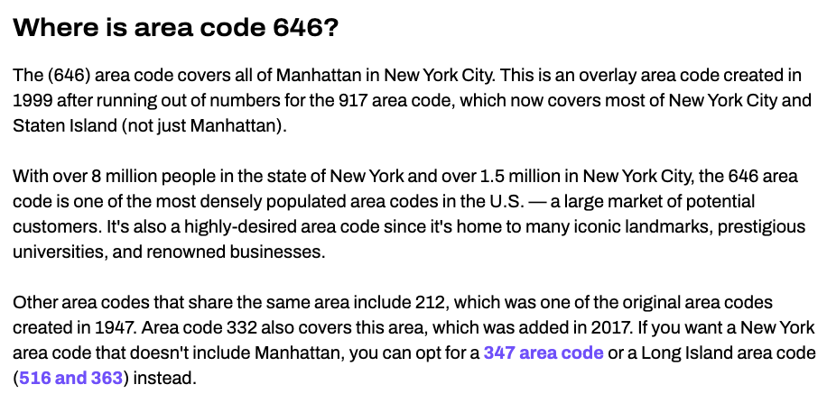Pagina de prefix 646 a lui Dialpad este un exemplu excelent al strategiei pe care o folosesc cu acest tip de conținut. Această pagină, ca multe altele din directorul local de numere de telefon, este structurată pentru a oferi informații esențiale chiar în partea de sus. Vizitatorii află imediat cele mai importante informații despre codul zonal 646: are sediul în Manhattan.