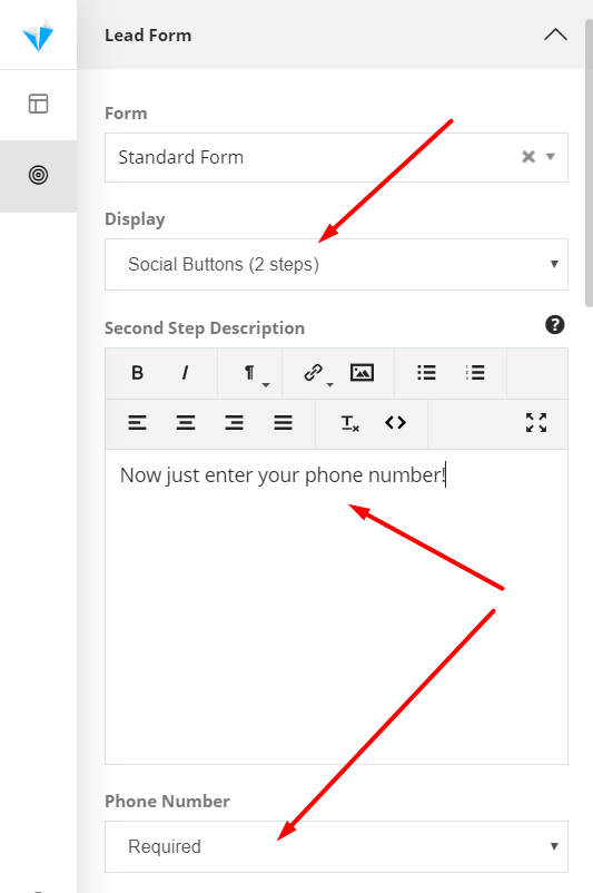 Pentru a captura numere de telefon, navigați la câmpul Număr de telefon și setați-l la Necesar . Asigurați-vă că selectați Butoanele sociale (2 pași) și scrieți o scurtă descriere a pasului al doilea , unde veți captura numărul de telefon.