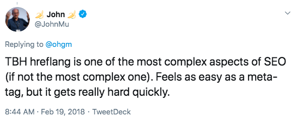 Iată un tweet de la Google Webmaster Trends Analyst, John Mueller, care explică cât de greu poate fi hreflang-ul!