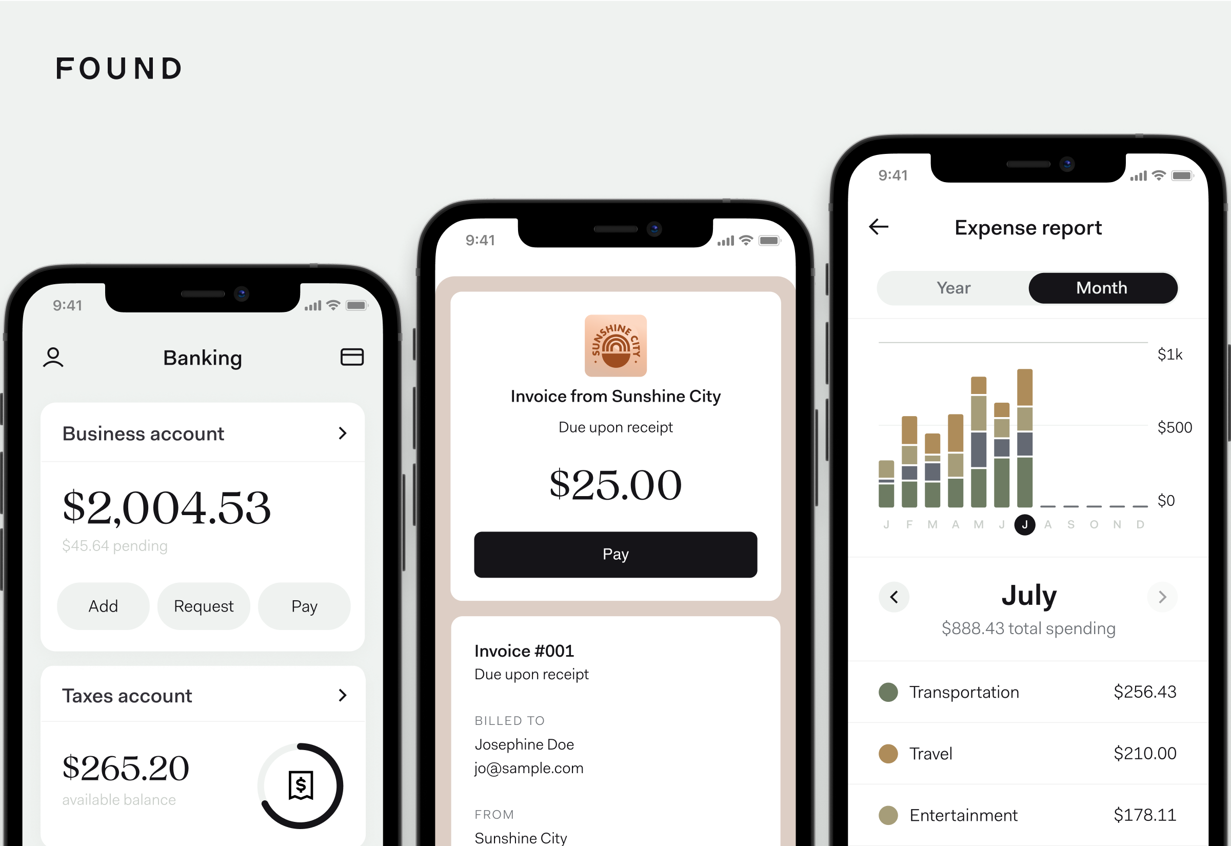 Found oferă o aplicație web și mobilă (atât pentru iOS, cât și pentru Android). Cu Found, utilizatorii pot rula rapoarte, pot clasifica cu ușurință cheltuielile, pot trimite și personaliza facturi, pot salva chitanțe, pot vedea estimări fiscale în timp real și pot genera formulare de Schedule C — totul din aplicație.
