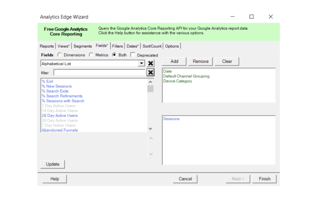 Analytics Edge este un program de completare Microsoft Excel gratuit care vă permite să interogați datele din Google Analytics într-o foaie de calcul Excel. Această metodă este cea mai simplă, deoarece nu necesită costuri și este ușor să selectați datele de care aveți nevoie, deoarece există meniuri derulante pentru a vă afișa toate câmpurile disponibile în Google Analytics.
