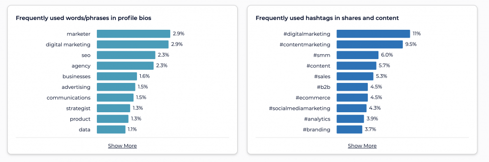 Audiența Hubspot este în mare parte agenți de marketing. Aruncă o privire la aceste date SparkToro care prezintă hashtag-urile și cuvintele cheie bio utilizate cel mai frecvent de adepții lor: