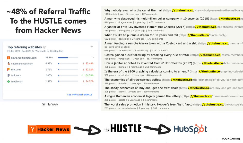Dacă nu sunteți familiarizat cu Hacker News; este, în esență, un subreddit/comunitate pentru antreprenorii, dezvoltatorii și inovatorii din tehnologie care lucrează în și pe companii cu creștere mare. O căutare rapidă pentru „TheHustle.co” în Hacker News arată o mulțime de conținut în comunitate: