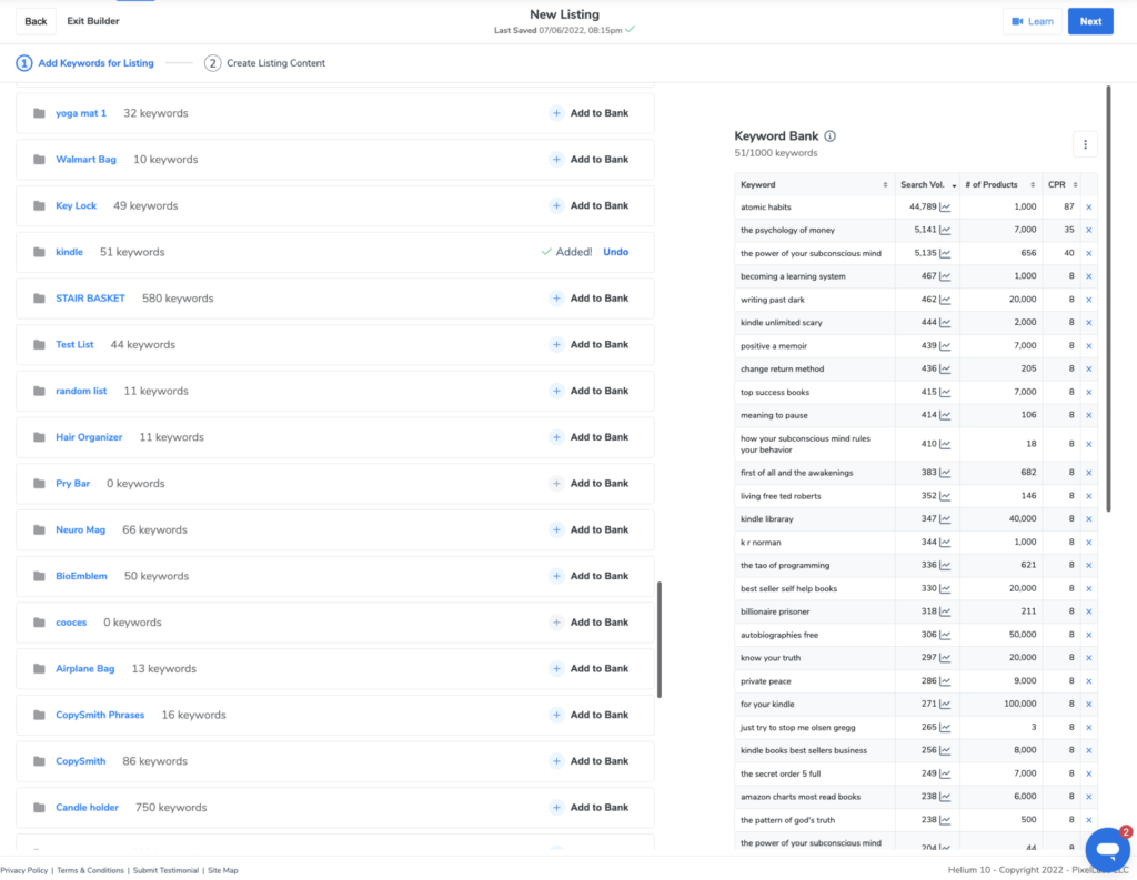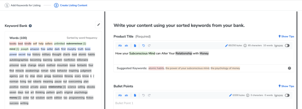 Acum, aceste cuvinte cheie nu sunt super relevante, deoarece nu au fost bine sortate sau filtrate pentru relevanță. Acestea sunt astfel încât să puteți vizualiza și să vă familiarizați cu ceea ce veți vedea când deschideți Listing Builder. Cu toate acestea, pe măsură ce introduceți informațiile despre înregistrare în panoul din dreapta, rețineți că veți primi sugestii de cuvinte cheie și expresii, precum și că veți putea vedea cuvintele cheie șterse, frecvența cu care au fost utilizate, precum și numărul generat. volumul de căutare.