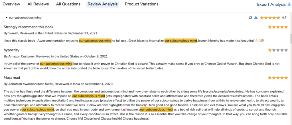 Și ca și cum asta nu ar fi suficient, fila Analiză revizuire vă oferă o modalitate bună de a intra în capul potențialului dvs. client și de a crea o legătură emoțională cu cumpărătorul. Instrumentul distilează toate recenziile în informații de dimensiuni mici, digerabile, permițându-vă să vedeți cele mai frecvent utilizate expresii și unde pot fi găsite acele fraze.